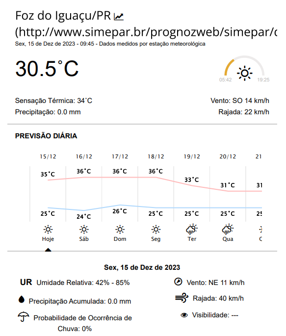 Sexta-feira (15) ensolarada em Foz do Iguaçu, com muito calor: temperaturas entre 25 e 35 graus.