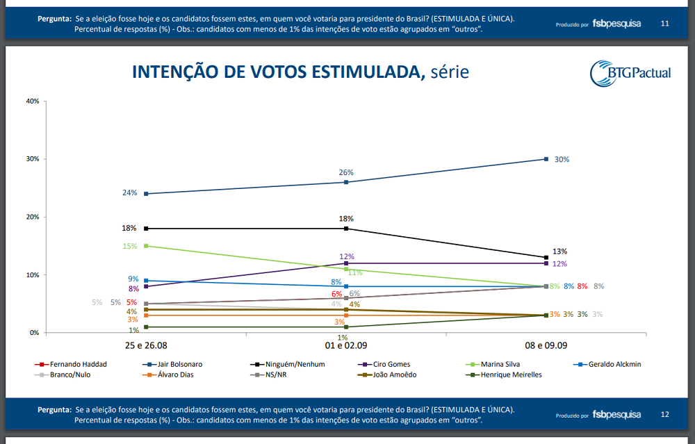 Pesquisa realizada pelo FSBPesquisa, entre os dias 8 e 9 de setembro, portanto depois do atentado contra o presidenciável Jair Bolsonaro, revela um crescimento do candidato de 4 pontos percentuais, em relação à pesquisa anterior realizada pelo mesmo instituto.