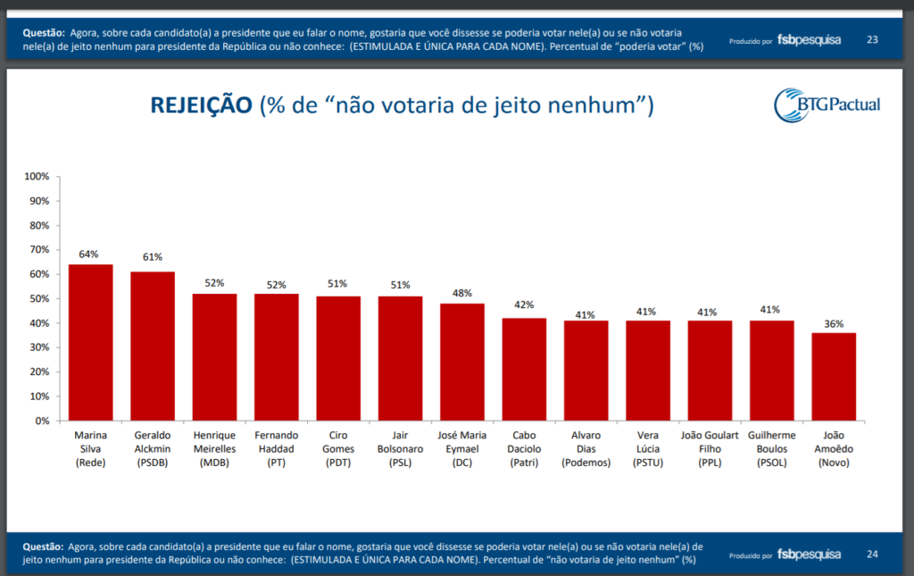 A candidata Marina Silva, por sua vez, é a mais rejeitada.