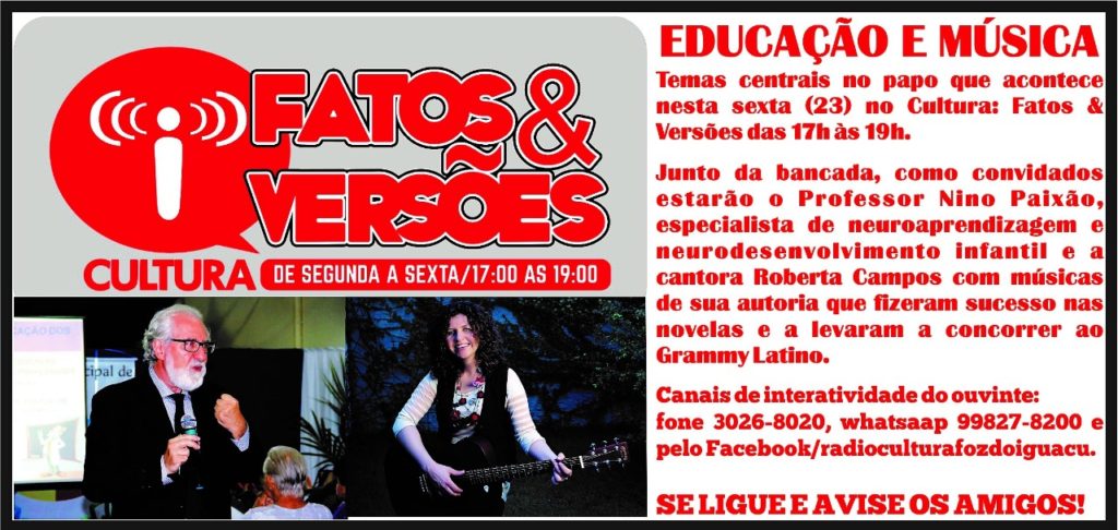 Nélio Sander, âncora do Cultura: Fatos & Versões, da Rádio Cultura, sempre presenteia os ouvintes do programa pela qualidade dos seus convidados. Hoje (23), por exemplo, os convidados são a cantora Roberta Campos, conhecida nacionalmente, e o professor de neuroaprendizagem Nino Paixão.