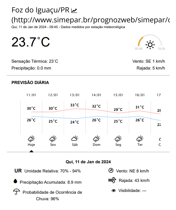 Quinta-feira (11) com pancadas de chuva em Foz do Iguaçu e temperaturas variando entre 26 e 30 graus, para dar um pequeno refresco.
