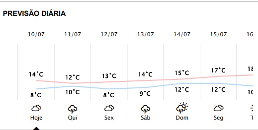 A onda de frio que atinge Foz do Iguaçu deve se intensificas nos próximos dias, conforme mostra a tabela abaixo do Simepar.