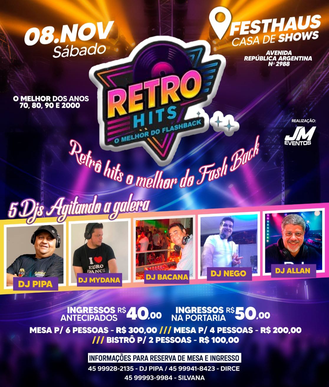 Foz do Iguaçu se prepara para uma noite inesquecível com o melhor do Flashback. A festa Retro Hits acontece neste sábado, 8 de novembro, a partir das 22 horas, na Festhaus (Av. República Argentina, 2988), e promete transportar o público diretamente para os tempos dourados das discotecas, das danceterias e das festinhas de garagem.