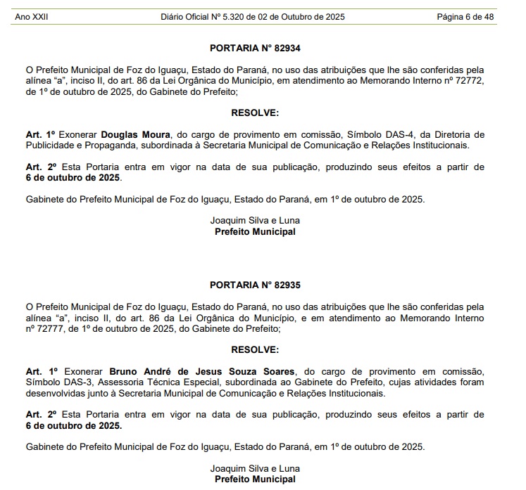 Ontem, 02 de outubro, o prefeito de Foz do Iguaçu, General Silva e Luna, exonerou o jornalista Bruno Soares e o diretor de Publicidade e Propaganda, Douglas Moura, dos cargos que desempenhavam na pasta.