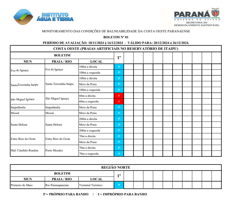 Ainda segundo o boletim (veja abaixo), nas praias da chamada Costa Oeste, formada pelo reservatório da hidrelétrica de Itaipu, a única praia imprópria para banho é a de São Miguel do Iguaçu.