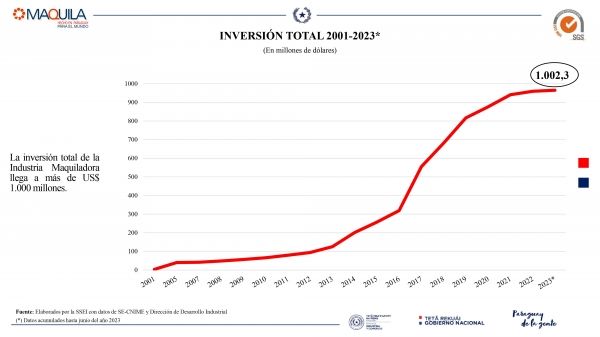 O Ministério da Indústria e Comércio (MIC) do Paraguai, que preside o Conselho Nacional das Indústrias Maquiladoras Exportadoras (CNIME), destacou no relatório do primeiro semestre de 2023, que o investimento total nas indústrias maquiladoras chegou a US$ 1 bilhão de dólares. Isso significa que duas décadas de vigência do regime, o setor atingiu o maior nível de capacidade produtiva de toda a história.