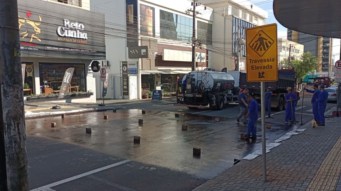 A Rua Almirante Barroso, no centro de Foz do Iguaçu, está totalmente interditada no trecho entre a Avenida Jorge Schimmelpfeng e a Rua Edmundo de Barros para a execução de uma faixa elevada para travessia de pedestres, em frente ao Colégio Caesp. As obras estão em andamento e devem ser concluídas na tarde desta sexta-feira (12).