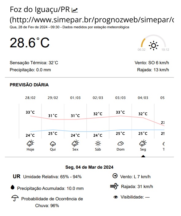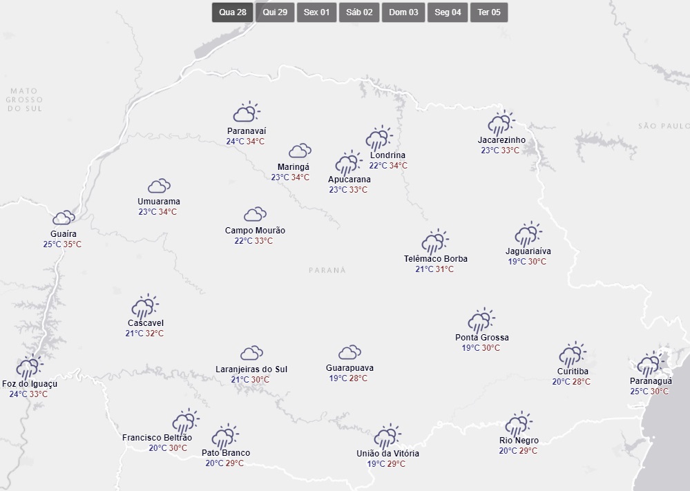 Por exemplo, às 9h30 desta manhã, o Simepar registrava 28,6 graus, mas a sensação térmica era de 32 graus, conforme mostra a tabela abaixo.