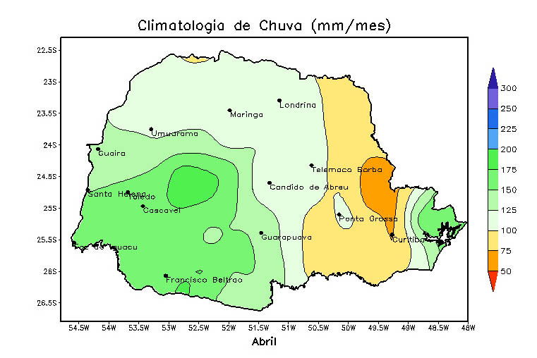 Abril, no Paraná, é um mês de muita chuva no Oeste, Sudoeste e Litoral, e pouca chuva no Vale do Ribeira e Norte Pioneiro.