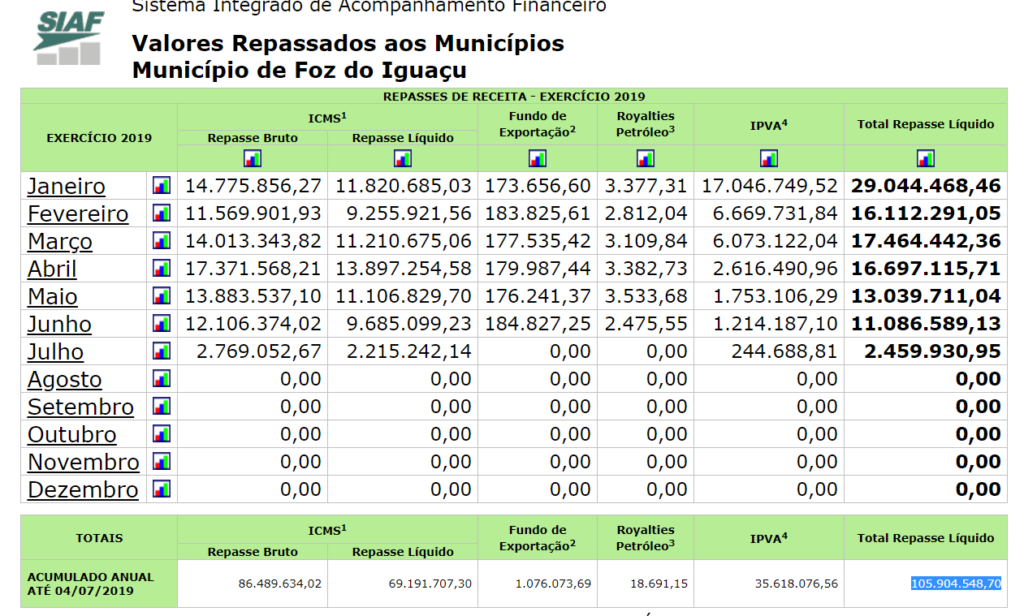 Foz do Iguaçu, até esta quinta-feira (04), recebeu R$105.904.548,70.