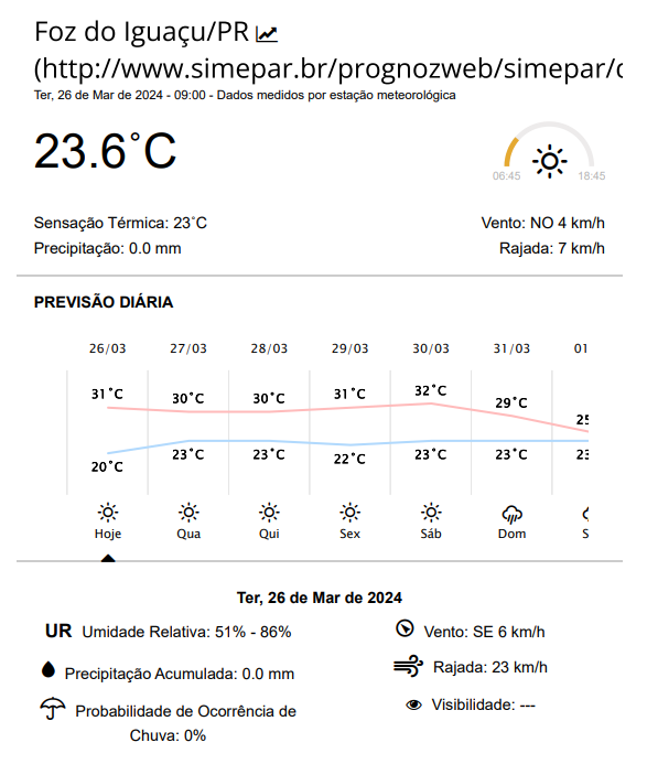 Terça-feira (26) ensolarada em Foz do Iguaçu, com máxima de 31 graus.