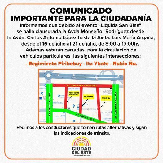 A Prefeitura de Ciudad del Este, no Paraguai, informa que, a partir desta terça-feira (16), o trânsito no município vai sofrer alterações, devido à promoção “Liquida San Blas”.