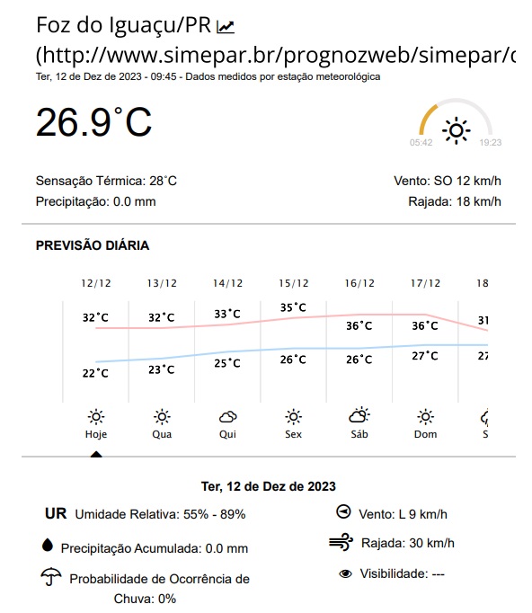 Terça-feira (12) ensolarada em Foz do Iguaçu, mas bastante quente: 22 de mínima e 32 graus de máxima.