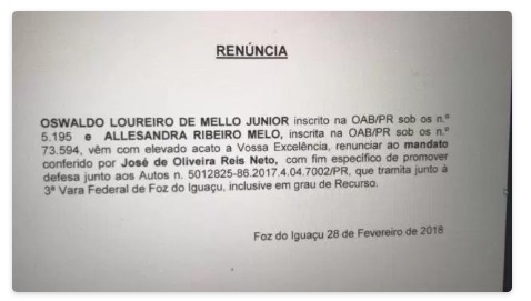 Segundo a ave, Osvaldo Loureiro e Allesandra Ribeiro Melo não são mais advogados de Cazuza. Eles renunciaram à defesa do assessor no último dia 28 de fevereiro.