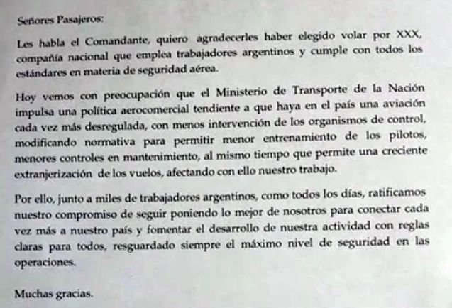 Além disso, este tipo de informe não está incluído nas mensagens que os pilotos devem passar aos passageiros, porque pode ser considerado um risco para o voo. Os pilotos que descumpriram esta norma e leram o recado sindical podem ser punidos.