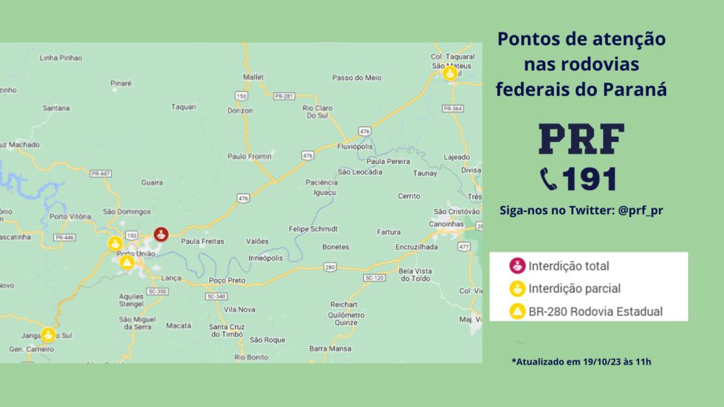 📍BR-153 km 459, União da Vitória – Desvio para a estadual PR-280 (bloqueada para deslocamento sentido sul).