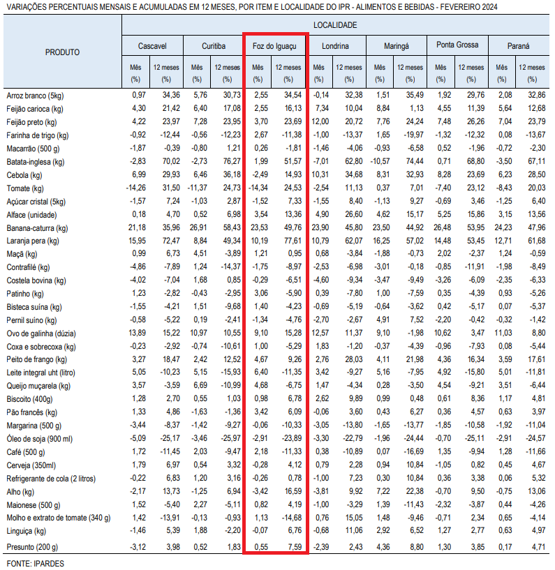 Confira abaixo os alimentos e bebidas que mais aumentaram de preços, nos últimos 12 meses, segundo o Ipardes, nas principais cidades do Paraná, com destaque de Foz do Iguaçu em vermelho (já os alimentos que caíram de preços estão com um sinal de menos na frente, ok?)