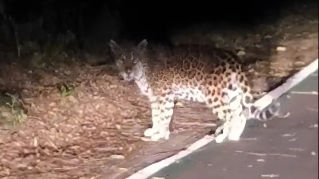 Uma onça-pintada fêmea, identificada como Cacira, foi flagrada descansando tranquilamente às margens do trajeto por Nadir Ferreira de Carvalho, motorista que registrou o momento em vídeo.