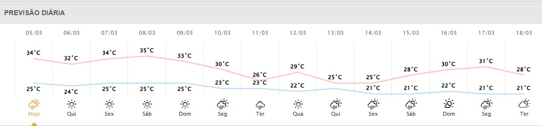 Os próximos dias seguem essa mesma tendência de calor, com temperaturas entre 32 e 35 graus.