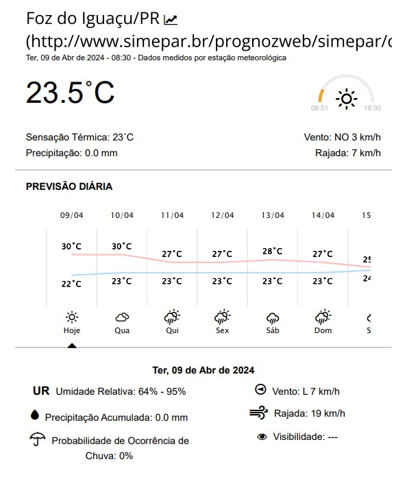 Vale ressaltar que ontem (07), a temperatura máxima atingiu 31,4 graus e sensação térmica foi de 35 graus, às 17 horas, em Foz
