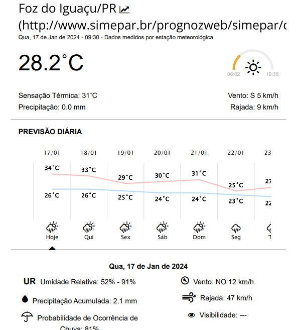 Quarta-feira (17) com tempo encoberto, abafado e previsão de temperatura máxima de 34 graus, em Foz do Iguaçu