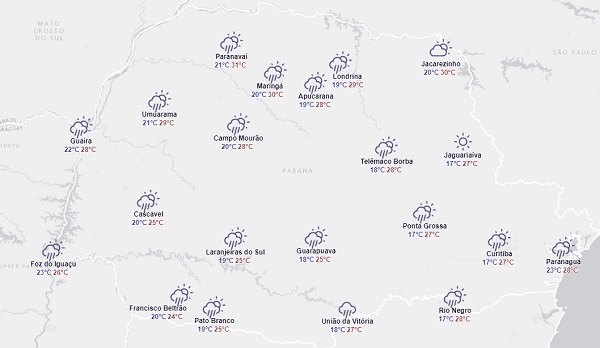 Sexta-feira (03) com sol entre nuvens em Foz do Iguaçu, pancadas de chuva, tempo abafado e possibilidade de raios à tarde. A máxima chega aos 26 graus.