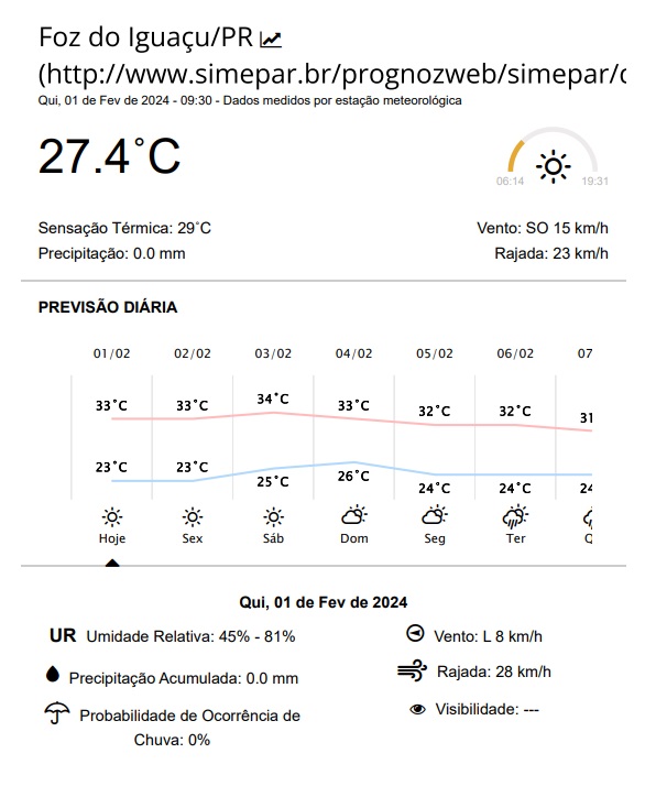Quinta-feira (1º) ensolarada em Foz do Iguaçu e, praticamente, com a mesma previsão de ontem: temperaturas entre 23 graus e 33 graus, além de umidade relativa do ar chegando a 45%.