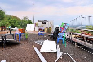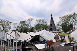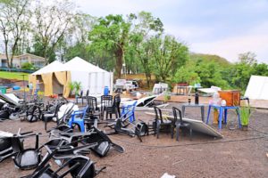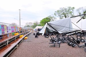 As tendas montadas para abrigar os devotos durante as celebrações ficaram retorcidas.