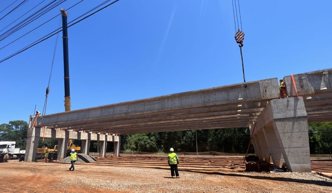 Foram transportadas 18 vigas longarinas de 34 metros de comprimento e pesando 60 toneladas cada uma, do canteiro da obra até a estrutura do novo viaduto no km 2+260, onde já foram lançadas sobre a mesoestrutura. Na sequência serão colocadas as lajes do viaduto e posteriormente concretadas.