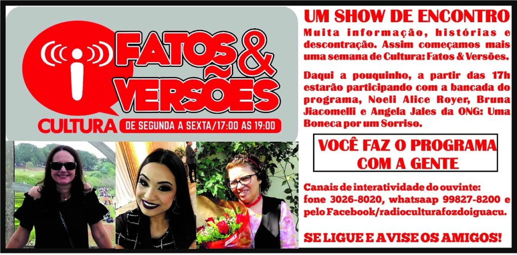 O programa “Cultura: Fatos&Versões” de hoje (19), da Rádio Cultura de Foz do Iguaçu, terá como convidadas três voluntárias da Ong “Uma Boneca por um Sorriso”. Vale a pena conferir o trabalho cativante delas. O programa vai ao ar a partir das 17 horas. Não percam!
