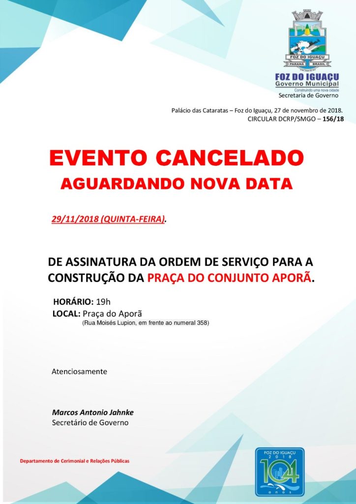 A única praça de Foz do Iguaçu que teria bancos parece que “bateu na trave”. A solenidade de hoje(29) para a assinatura da autorização para o início da obra foi cancelada, sem que a Prefeitura de Foz do Iguaçu explicasse o motivo. Vejam, abaixo, o comunicado enviado às redações dos veículos de comunicação.