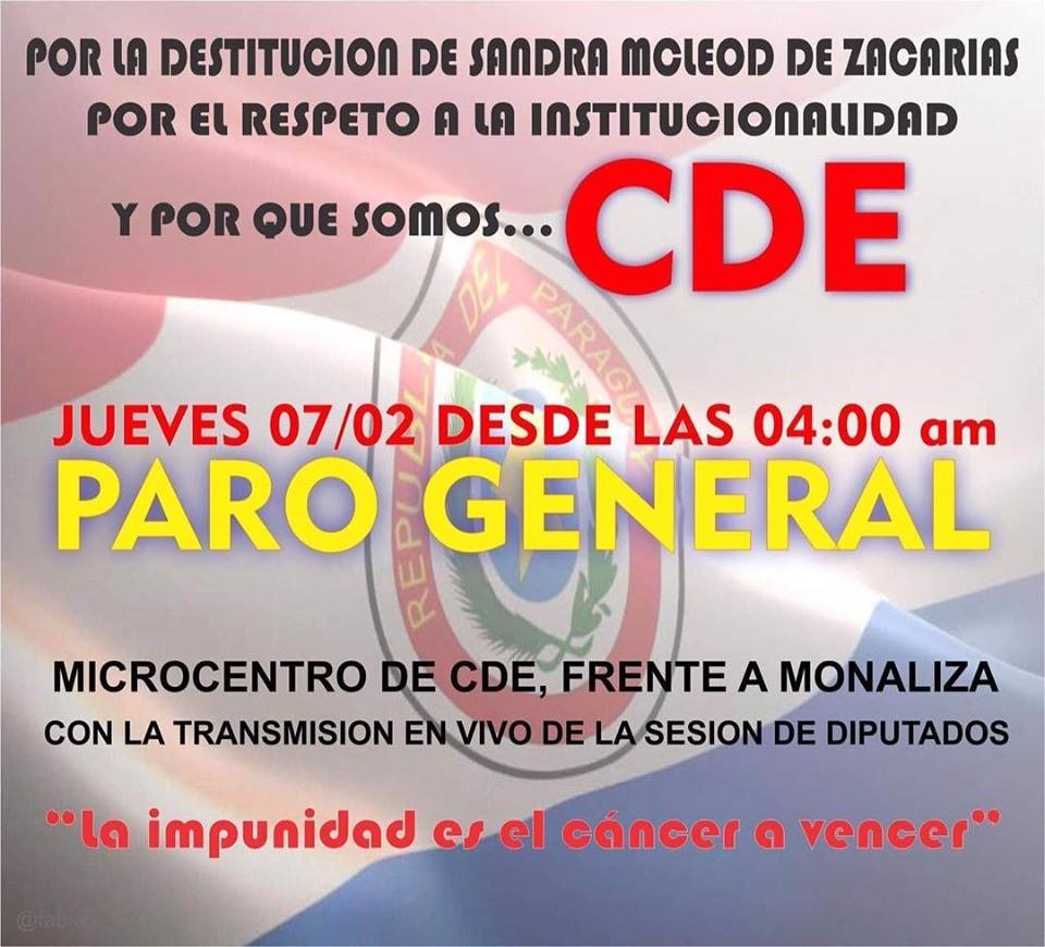 A população de Ciudad del Este está sendo mobilizada para participar, amanhã (07), de um movimento com a intenção de forçar destituição da prefeita afastada, Sandra Zacarias, do cargo, definitivamente.