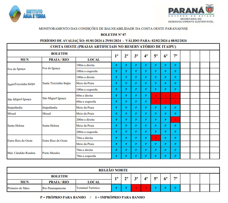 Os outros dois locais indicados como impróprios estão concentrados em São Miguel do Iguaçu, na praia artificial do Lago de Itaipu.