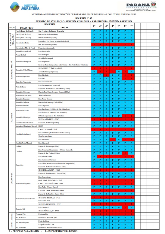 O sétimo boletim de balneabilidade, divulgado nesta sexta-feira (02) pelo Instituto Água e Terra (IAT), apontou que, apesar das fortes chuvas, houve uma melhora nas condições para banho nas praias e rios do Paraná.