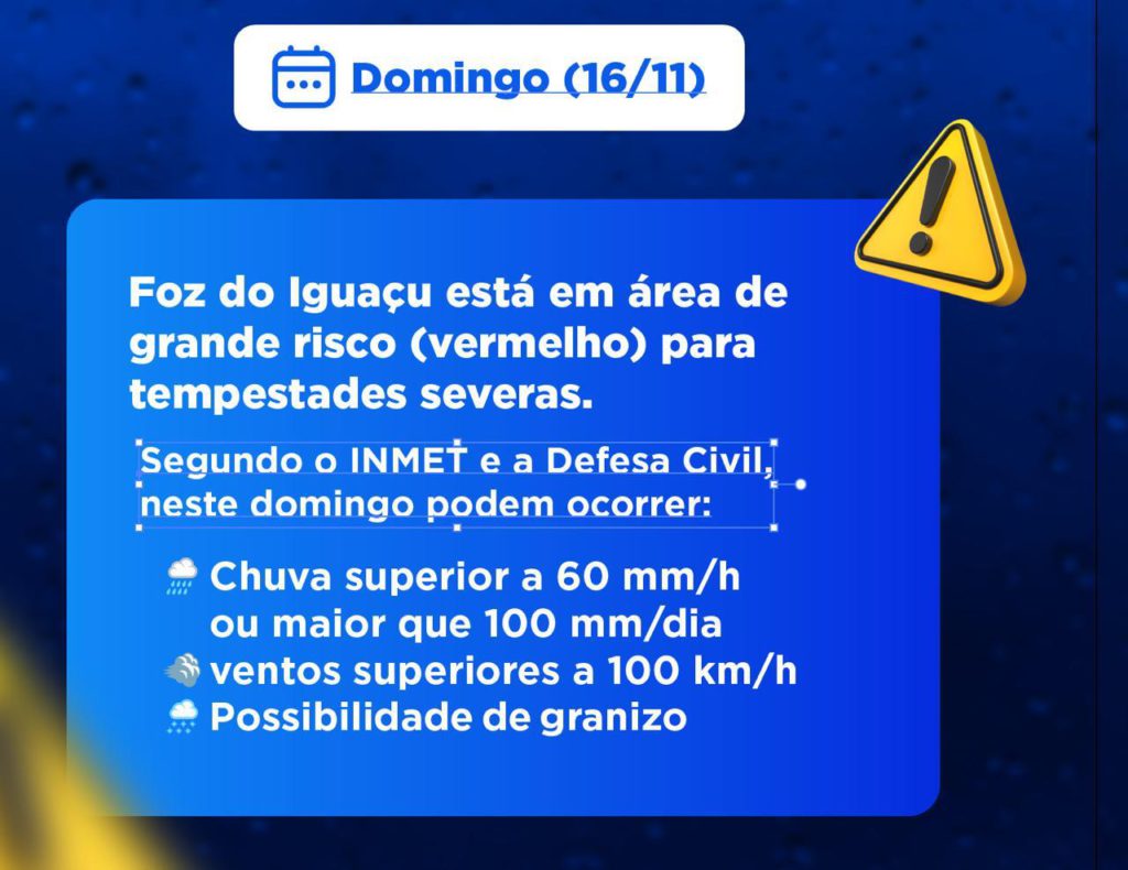 A Guarda Municipal de Foz do Iguaçu distribuiu na tarde desta sexta-feira (14) um alerta sobre a uma possível ocorrência de temporal na cidade no domingo, dia 16 de novembro.