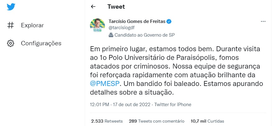 Candidato a governador de São Paulo, Tarcísio de Freitas postou a seguinte informação no twitter, agora há pouco.