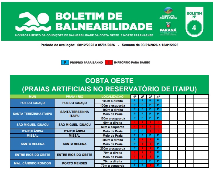 Duas praias localizadas na Costa Oeste, formadas pelo reservatório da usina de Itaipu, mais conhecido como Lago de Itaipu, estão impróprias para banho, segundo o novo boletim do Instituto Água e Terra (IAT), com validade de 09 a 15 de janeiro.