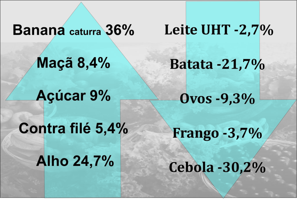 Entre os itens em que houve queda no preço, destacam-se os tubérculos, raízes e legumes, com redução de 21,5%, seguidos das hortaliças e verduras com queda de 12,7%, e frutas, com variação negativa de 8,4%. Destaca-se ainda a queda nos preços das aves e ovos (-5,4%) e higiene pessoal (-6%).