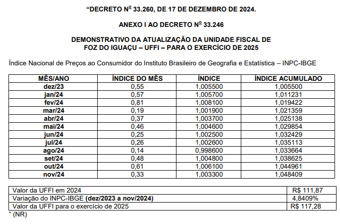 O valor da Unidade Fiscal de Foz do Iguaçu (UFFI) vai aumentar 4,8409%, praticamente 5%, a partir de 2025.