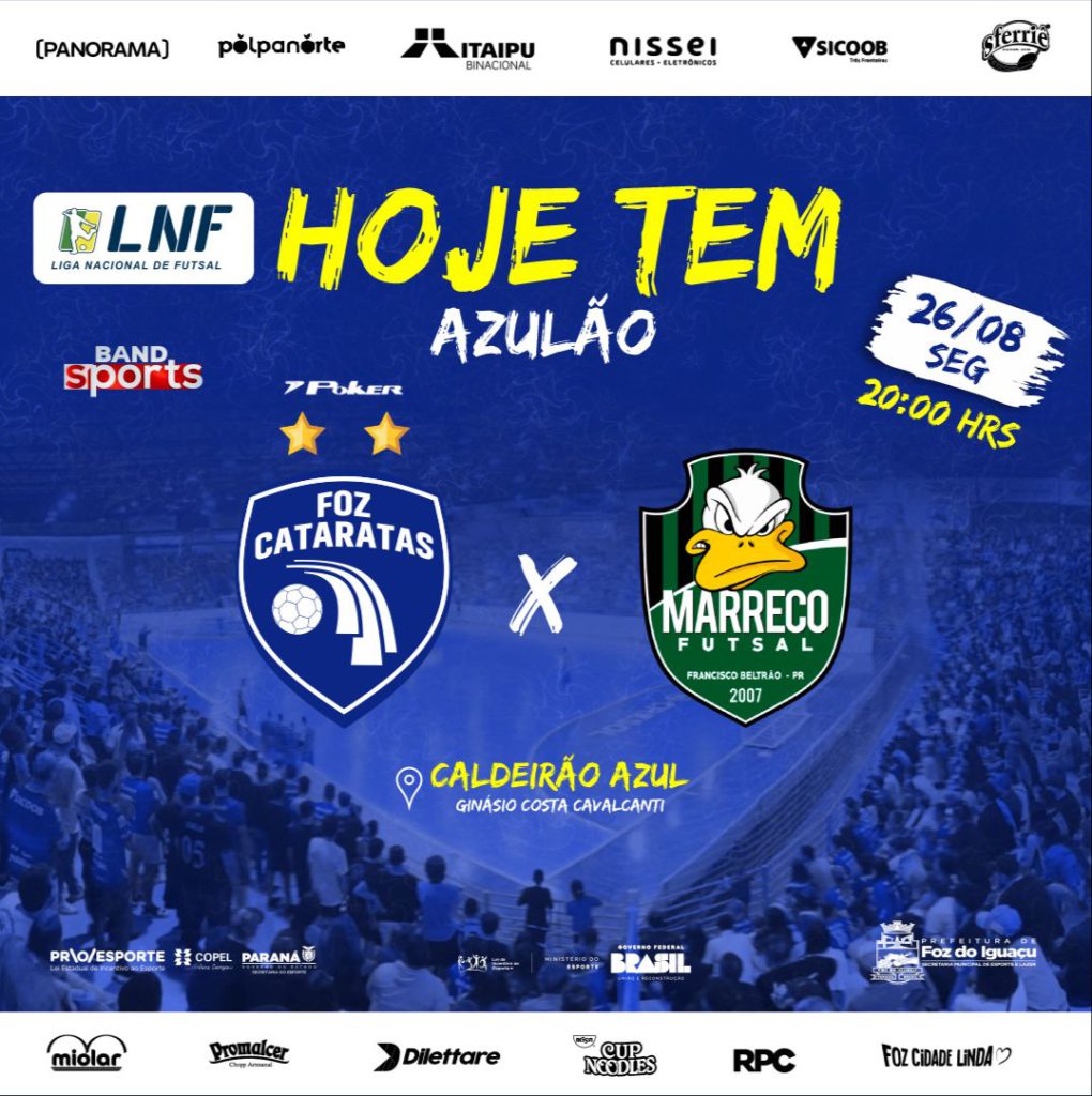 O Foz Cataratas Poker Futsal encara o Marreco, pela 21ª rodada da Liga Nacional de Futsal, nesta segunda-feira, 26 de agosto, às 20 horas, no Ginásio Costa Cavalcanti, o Caldeirão Azul. A partida será transmitida pelo canal de televisão Band Sports e pela LNFTV, no seu canal no Youtube.