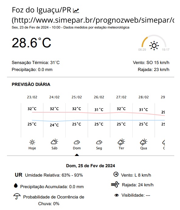 Sexta-feira (23) ensolarada em Foz do Iguaçu, com temperaturas variando entre 25 e 32 graus.
