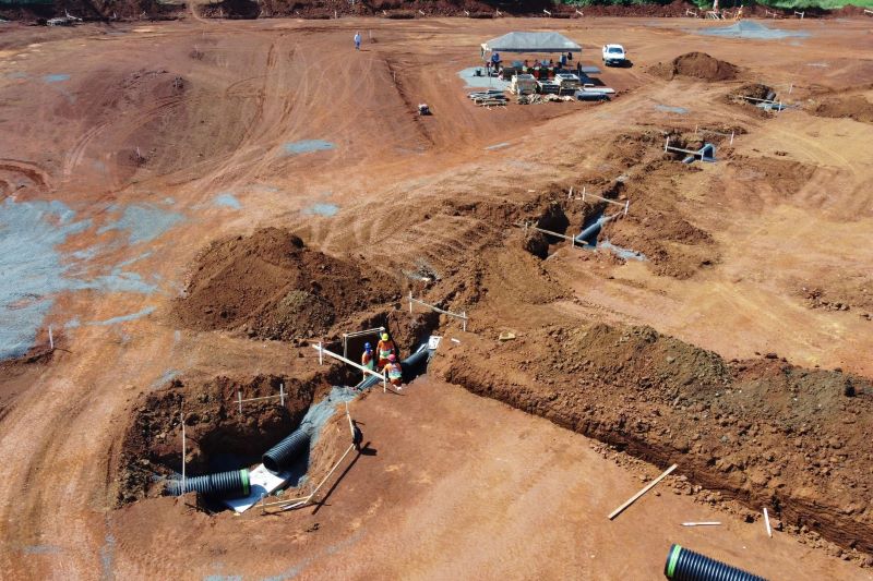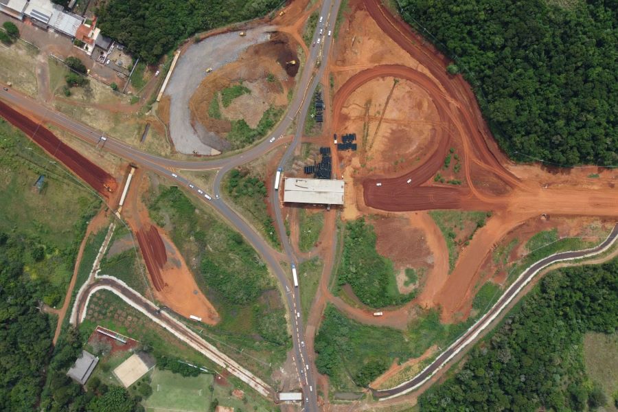 Na nova aduana Brasil – Argentina é realizada a terraplenagem de desvio de tráfego da Avenida Mercosul, necessário para avançar na infraestrutura do edifício. Também estão ocorrendo no local os serviços de implantação do sistema de drenagem de águas, com instalação de tubos de Polietileno de Alta Densidade (Pead).