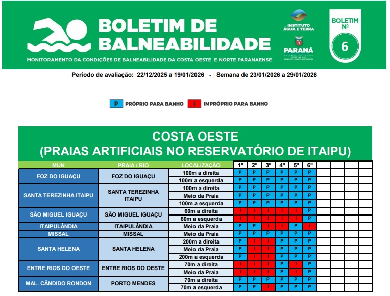 O último boletim de balneabilidade divulgado pelo Instituto Água e Terra (IAT), com validade de 23 a 29 de janeiro, informa que, na Costa Oeste, formada pelo Lago de Itaipu, apenas uma praia está imprópria para banho.