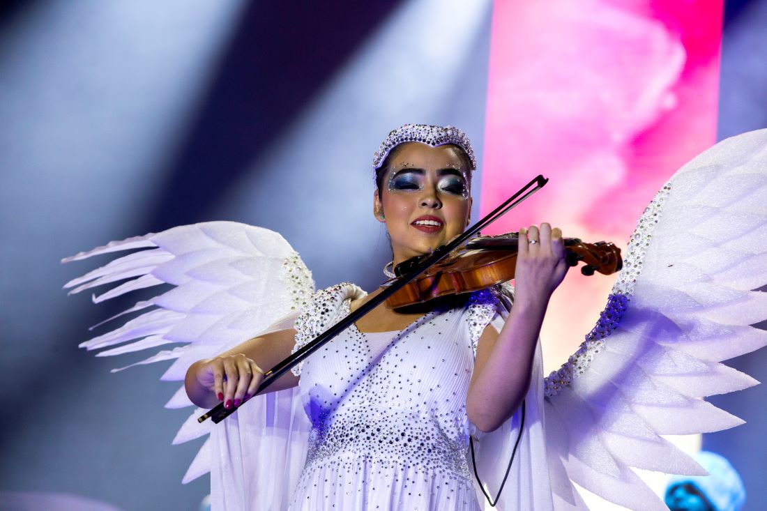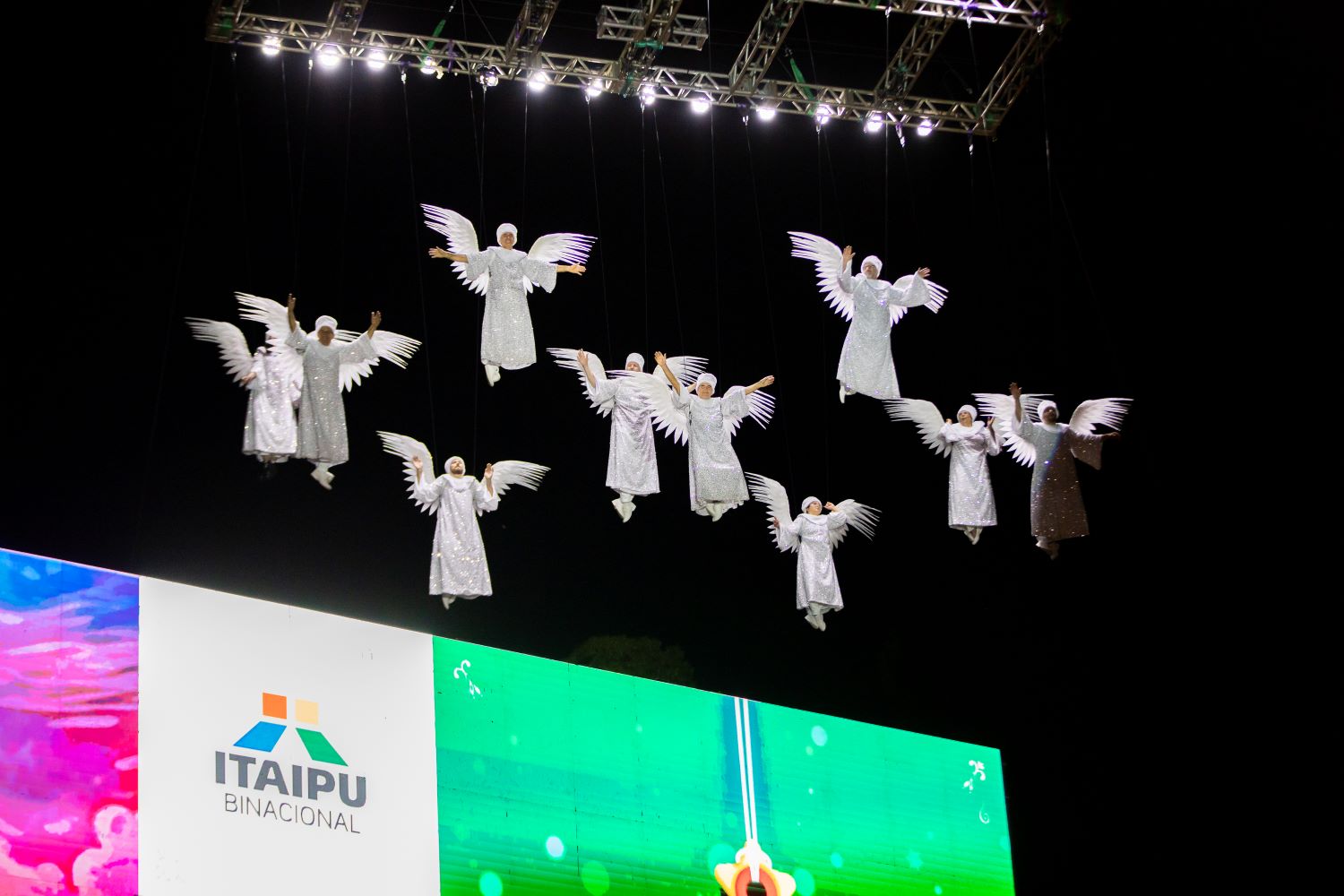 Vestidos de anjos, alguns deles, inclusive, foram içados sobre a estrutura por uma grua. E quem também chegou do céu foi o Papai Noel, que arrancou aplausos do público em seu trenó puxado por renas.