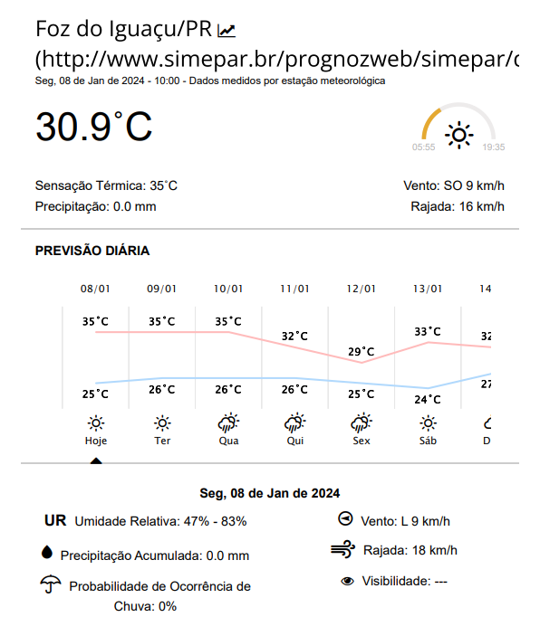 Vale ressaltar que ontem, a estação de meteorologia do Simepar em Foz do Iguaçu registrou máxima de 36,7 graus às 16 horas.
