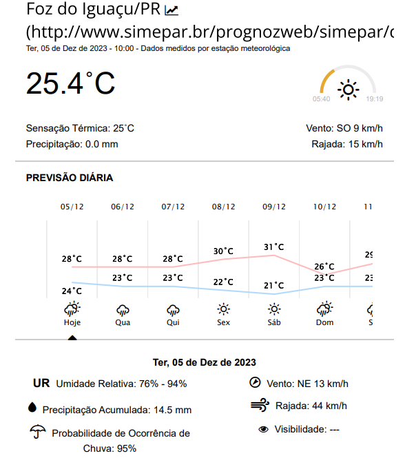 Terça-feira (05) com chuva e sol entre nuvens em Foz do Iguaçu, além de calor, claro: mínima de 25 graus e máxima de 28 graus.