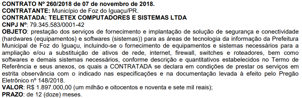 Segundo o contrato, a empresa Teletex Computadores e Sistemas Ltda será responsável pela “prestação dos serviços de fornecimento e implantação de solução de segurança e conectividade (hardwares (equipamentos) e softwares (sistemas)) para as áreas de tecnologia da informação da Prefeitura Municipal de Foz do Iguaçu”.