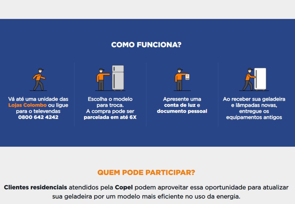 O desconto é um bônus custeado pela Copel sob a condição de entrega do equipamento antigo, a fim de retirar de circulação eletrodomésticos que consomem mais energia elétrica do que os modelos atuais.