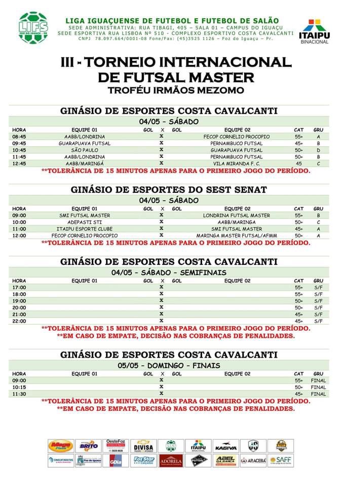 É o lll Torneio Internacional Master de Futsal, competição que começou em 2022 com 9 equipes e que contará com 27 equipes de quatro estados e do Paraguai, divididos nas categorias 45+, 50+ e 55+.