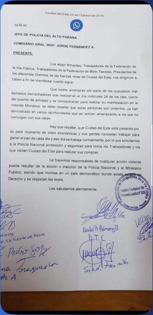 Se, de um lado, uns querem fechar a ponte, de outro lado, sindicatos paraguaios encaminharam documento ao chefe de polícia de Alto Paraná, Jorge Fernández, solicitando a intervenção policial para impedir o movimento.
